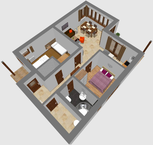 Bungalov se 2 ložnicemi BB5 je přízemní velmi prostorný bungalov pro větší rodinu bez vnitřních schodů až pro 5 osob.